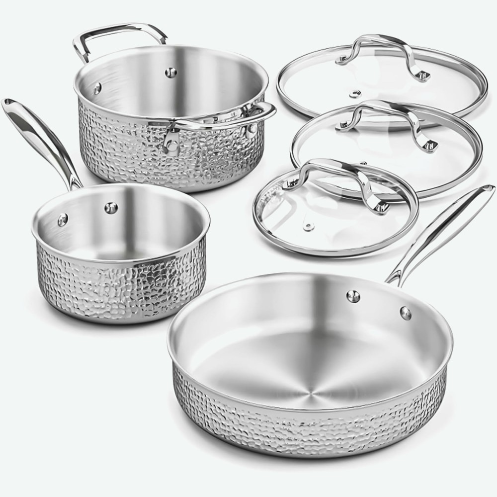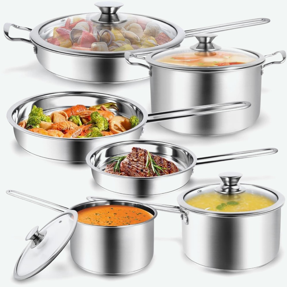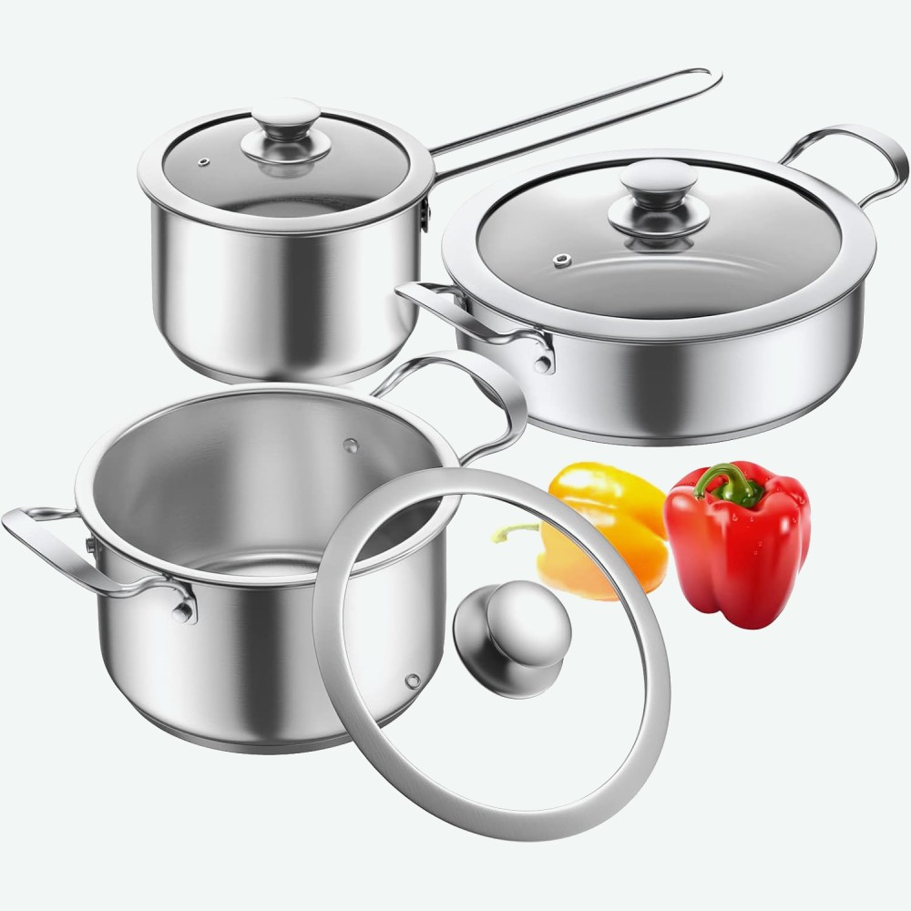 Cookware Set Includes: 2 Qt Pot with Lid, 2.6 Qt Pot with Lid, and 3.7 Qt Pot with Lid. Premium Quality Construction: Crafted with a 3-ply stainless steel base and a thick aluminum core, ensuring fast, even heat distribution and exceptional durability for long-lasting performance.